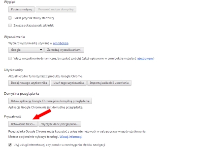 W otwartym menu wybieramy opcję „Ustawienia”. W otwartym oknie na samym dole będzie przycisk „Pokaż ustawienia zaawansowane”. Wówczas pojawi się kilka dodatkowych pozycji. Klikamy w link „Ustawienia treści” w polu „Prywatność”.