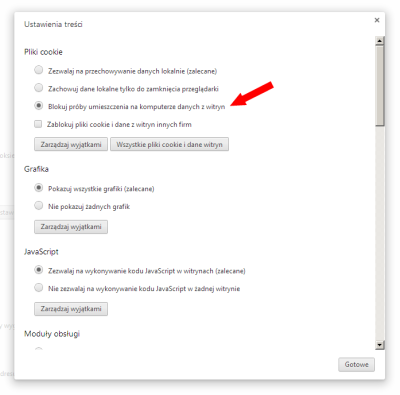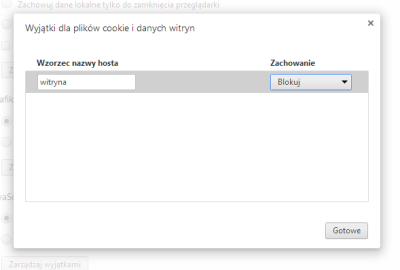 Można też zablokować obsługę ciasteczek na określonej witrynie. W tym celu w powyżej przedstawionym zrzucie ekranu pozostawiamy zaznaczoną opcję „Zezwalaj na przechowywanie danych lokalnie (zalecane)”, ale klikamy w przycisk „Zarządzaj wyjątkami”. W nowo otwartym oknie wpisujemy kluczową część adresu witryny (np. „adreswitryny” dla „adreswitryny.com”) i wybieramy opcję „blokuj”, po czym klikamy przycisk gotowe.