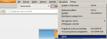 W najnowszych odsłonach przeglądarki Mozilla Firefox domyślnie schowany jest pasek menu. Aby go otworzyć należy wcisnąć lewy klawisz Alt lub F10 i wybieramy z menu pozycję „Narzędzia”, a tam „Opcje”: