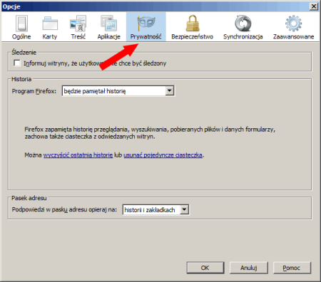 W otwartym oknie wybieramy zakładkę „Prywatność”, tak jak zostało to pokazane poniżej:
