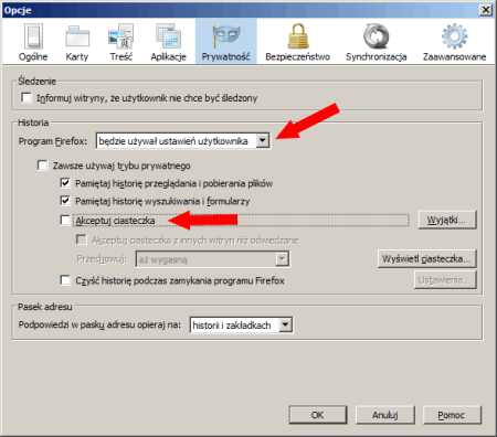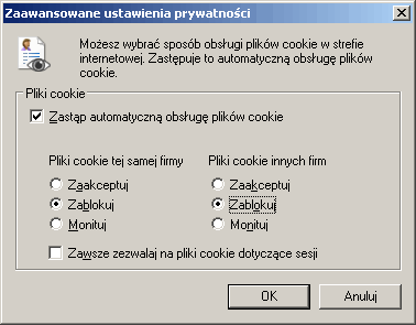 Nieco niżej odznaczamy opcję „Akceptuj ciasteczka”. Po tych zabiegach klikamy w przycisk OK.