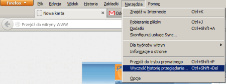 Można też wyczyścić wszystkie dotychczas zgromadzone ciasteczka. W tym celu w głównym menu (po wciśnięciu F10 lub lewego klawisza Alt) wybieramy ponownie „Narzędzia”, a tam „Wyczyść historię przeglądania”.