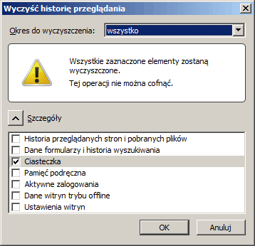 W nowo otwartym oknie wybieramy „wszystko” w polu „Okres do wyczyszczenia” oraz zaznaczamy opcję „Ciasteczka” odznaczając pozostałe pola, tak jak na poniższym zrzucie ekranu: