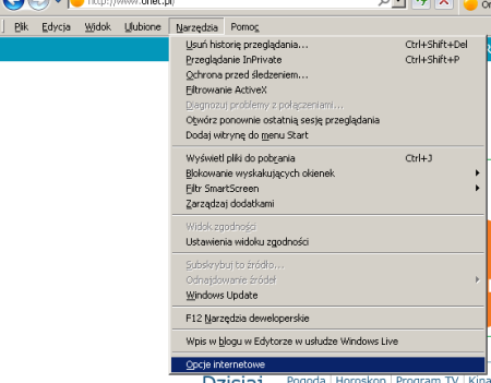 W najnowszych odsłonach przeglądarki Microsoft Internet Explorer domyślnie schowany jest pasek menu. Aby go otworzyć należy wcisnąć lewy klawisz Alt lub F10 i wybieramy z menu opcję „Narzędzia”, a z otwartego menu ostatnią pozycję „Opcje internetowe”: