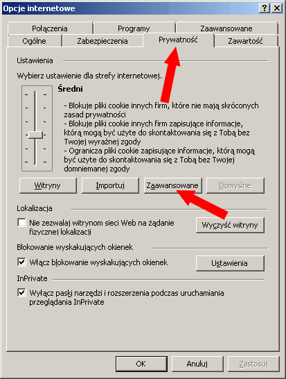 Po zatwierdzeniu w otwartym oknie wybieramy zakładkę „Prywatność”, a później klikamy w przycisk „Zaawansowane”.