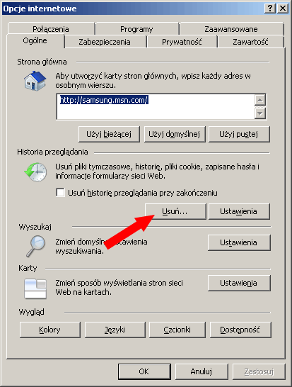 Można też wykasować wszystkie dotychczas zapisane dane witryn. W tym celu w otwartym wcześniej oknie „Ustawienia internetowe” klikamy w zakładkę „Ogólne” i tam wybieramy opcję „Usuń” wskazaną na poniższym zrzucie ekranu:
