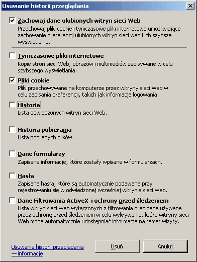Zaznaczona opcja „Zachowaj dane ulubionych witryn sieci Web” pozwala na zachowanie danych witryn, które mamy wpisane w zakładce „Ulubione”. Jeśli jej nie odznaczymy ciasteczka nie zostaną usunięte ze wszystkich witryn.