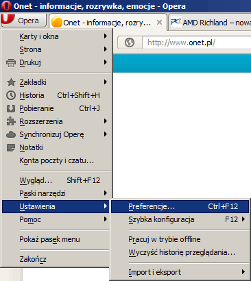 W przeglądarce Opera klikamy w przycisk „Opera” znajdujący się w lewym górnym rogu okna przeglądarki lub wciskamy lewy klawisz Alt. W otwartym menu wybieramy opcję „Ustawienia”, a później „Preferencje…”