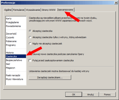 W nowo otwartym oknie wybieramy zakładkę „Zaawansowane”, a później z listy zamieszczone w lewej części okna wybieramy „Ciasteczka”. Powinniśmy zobaczyć takie oto opcje: