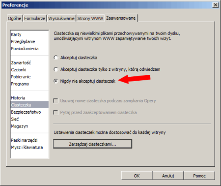Zaznaczamy opcję „Nigdy nie akceptuj ciasteczek” i klikamy w przycisk „OK”.